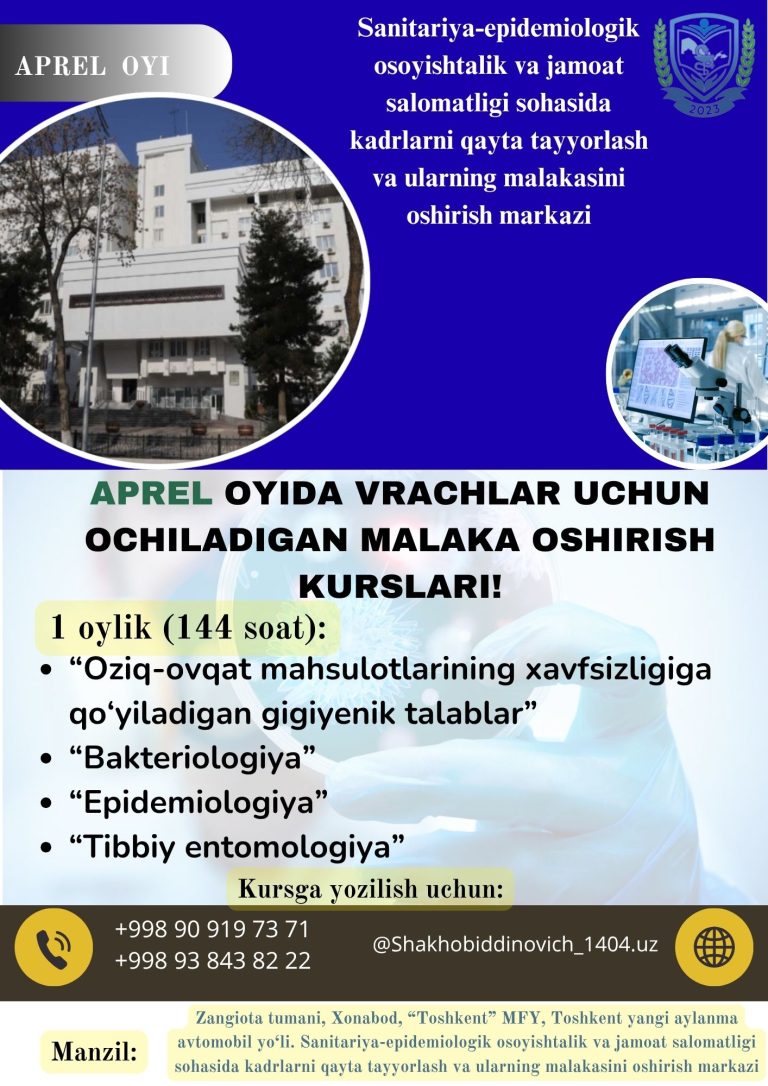 “Laboratoriya liderlari/rahbarlari uchun global dastur” (GLLP) bo‘yicha tanlov nomzodlari bilan suhbat o‘tkazildi Sanitariya-epidemiologik osoyishtalik va jamoat salomatligi sohasida kadrlarni qayta tayyorlash va ularning malakasini oshirish markazida xalqaro va milliy ekspertlar ishtirokida “Laboratoriya liderlari/rahbarlari uchun global dastur” (GLLP) bo‘yicha o‘qitish uchun…