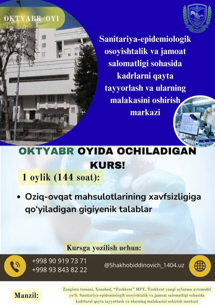 📚 «Oziq-ovqat mahsulotlarining xavfsizligiga qo‘yiladigan gigiyenik talablar» mavzusida bir oylik kurs tashkil etilmoqda!