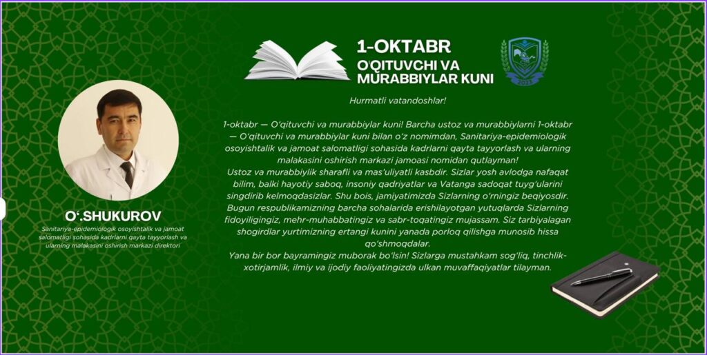 Hurmatli vatandoshlar! 1-oktabr — O‘qituvchi va murabbiylar kuni! Barcha ustoz va murabbiylarni 1-oktabr — O‘qituvchi va murabbiylar kuni bilan o‘z nomimdan, Sanitariya-epidemiologik osoyishtalik va jamoat salomatligi sohasida kadrlarni qayta tayyorlash va ularning malakasini oshirish markazi jamoasi nomidan qutlayman!