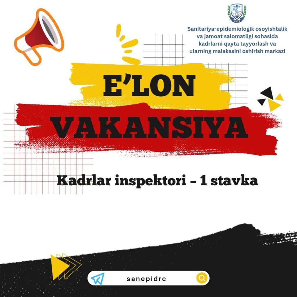 Sanitariya-epidemiologik osoyishtalik va jamoat salomatligi sohasida kadrlarni qayta tayyorlash va ularning malakasini oshirish markazi bo‘sh ish o‘rinlari uchun tanlov e’lon qiladi: