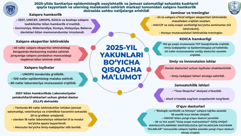 Sanitariya-epidemiologik osoyishtalik va jamoat salomatligi sohasida kadrlarni qayta tayyorlash va ularning malakasini oshirish markazi tomonidan xalqaro hamkorlik doirasida amalga oshirilgan ishlar bilan yuqoridagi infografika orqali batafsil ma’lumot olishingiz mumkin!